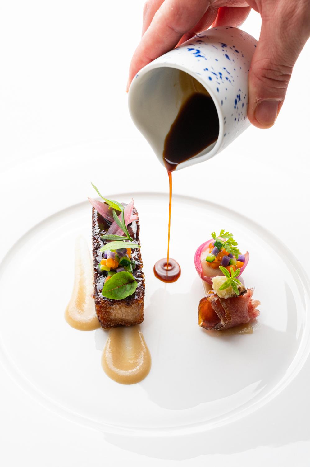Il ristorante propone cinque percorsi degustazione: Essenza con sei portate a 110 euro e abbinamento vini a 65 euro, Linfa con sette portate a 130 euro e abbinamento vini a 80 euro, e A mano libera, un itinerario di nove portate scelte dallo Chef proposto a 150 euro, con abbinamento vini a 95 euro. Si possono inoltre scegliere 3 portate a 85 euro e 4 portate a 95 euro. Tra i piatti proposti ci sono l’Espresso di crostacei, il Chashu di maiale e verza e gli Spaghettini con alghe, ricci di mare e pomodori bruciati.