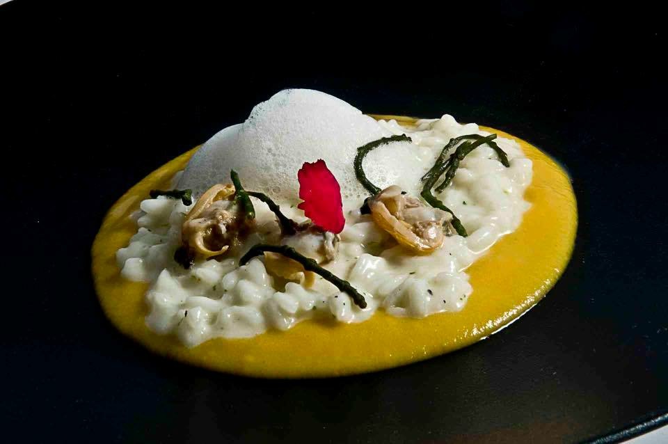 Tra i piatti proposti IL RISOTTO: Risotto con acqua di pomodoro giallo, scampi, aglio nero, limone e caviale di colatura di alici, LA CERNIA: Cernia, sedano rapa con lavanda, frutto della passione, funghi shitake e katsuobushi, L’AGNELLO: Agnello in crosta di sale con besciamella ai lamponi e nocciole, sesamo nero e alga Nori e IL LAMPONE: Lampone fermentato, kefir, crema al cioccolato fondente e sorbetto ai fiori di ibisco.
