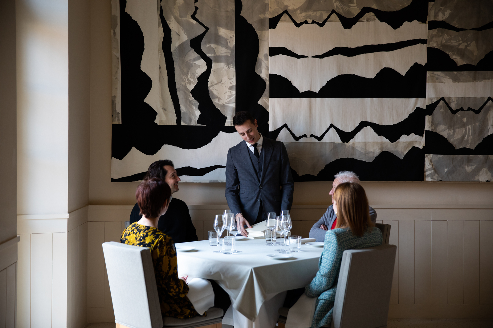 Acquisito nel 2000 dalla famiglia Ceretto, il palazzo è stato restaurato con un equilibrio sapiente: la facciata storica è rimasta intatta, mentre gli interni sono stati ripensati da architetti di fama internazionale come Steven Shaller e Bill Katz, creando ambienti di raffinata contemporaneità. La celebre Sala Rosa, con gli affreschi di Francesco Clemente, è il simbolo di un dialogo costante tra arte, territorio e cucina. Più intima, la sala di Louise Nevelson, arricchita dagli arazzi dell’artista, accoglie l’ospite in un’atmosfera intensa, dai toni scuri e avvolgenti. A completare questo scenario, opere come quelle di Catherine Ferguson e di Anselm Kiefer donano al luogo una dimensione artistica profonda.