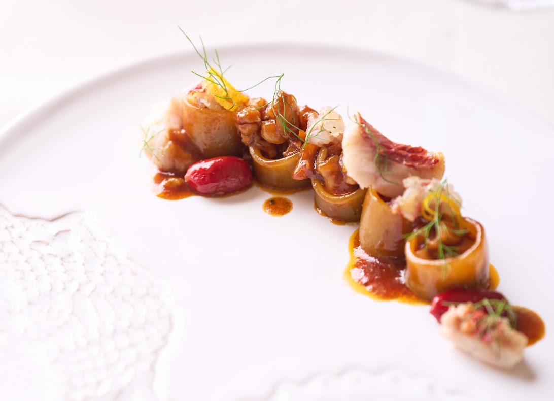 La cucina proposta da chef Mantarro, originario di Piedimonte Etneo, è una sintesi personale e intensa della tradizione isolana. Ogni piatto è costruito partendo da ingredienti del territorio, spesso poco noti, reinterpretati con rigore tecnico e creatività misurata. Il mare, la terra e la ricchezza dell’Etna convivono in una cucina che non rinuncia alle radici ma le rilegge con eleganza, tra antichi legumi, erbe spontanee e sapori netti.