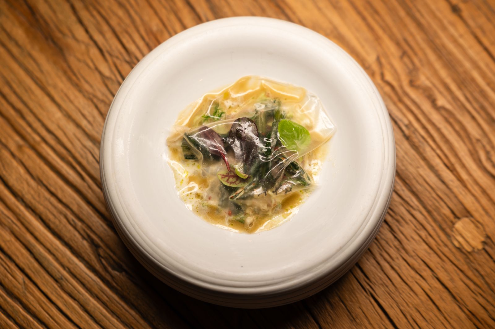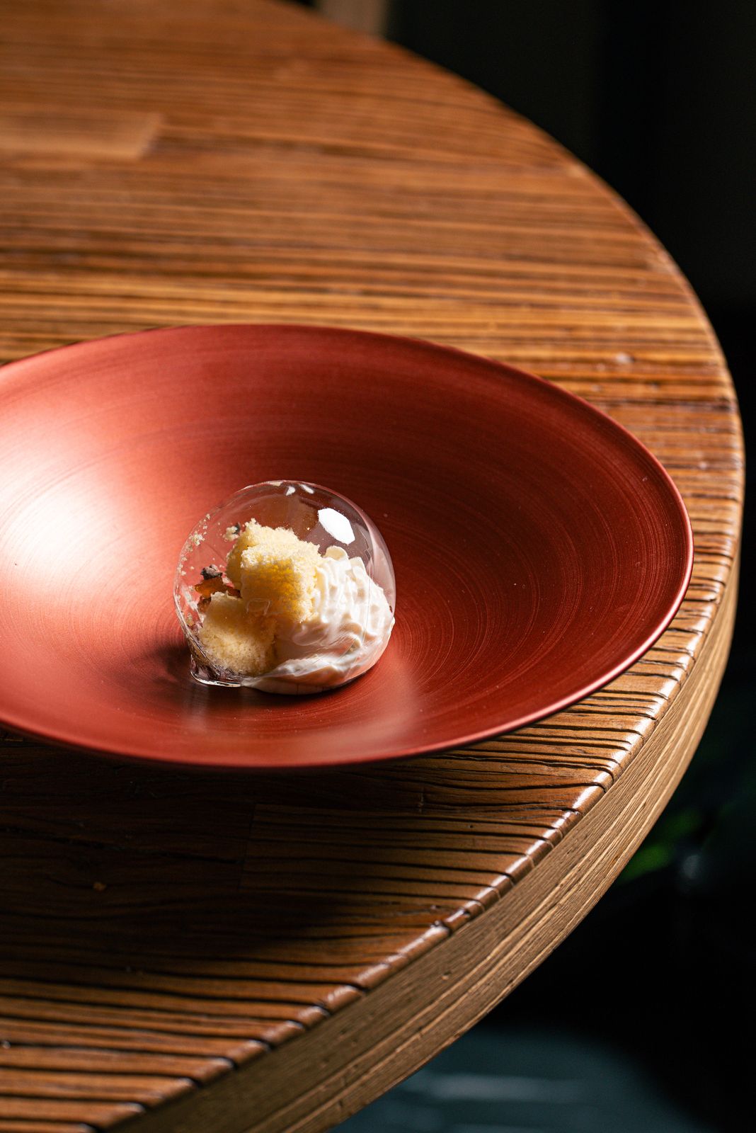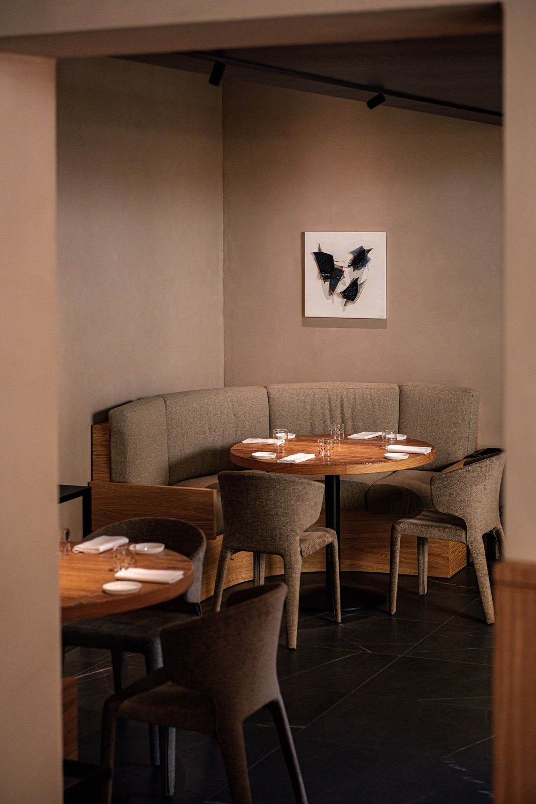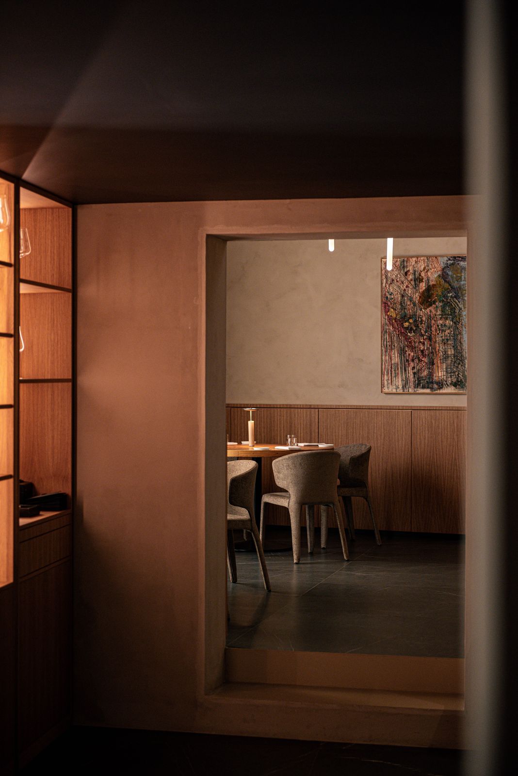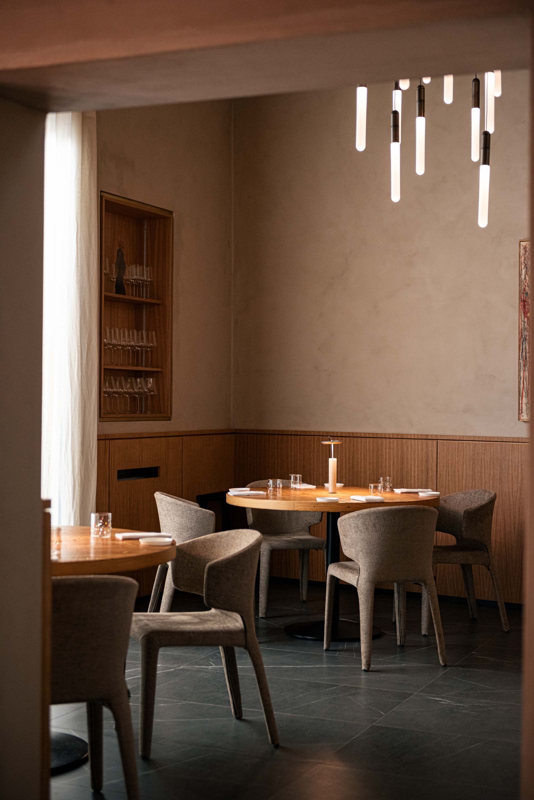 La sala, curata da Laura Codogno, è un’estensione naturale della cucina: accogliente e raffinata, con tavoli rotondi in legno, poltrone dalle linee essenziali e pareti decorate da opere contemporanee. Ogni elemento – la luce, i materiali, il ritmo del servizio – contribuisce a creare un’atmosfera in cui la convivialità si sposa con la precisione.