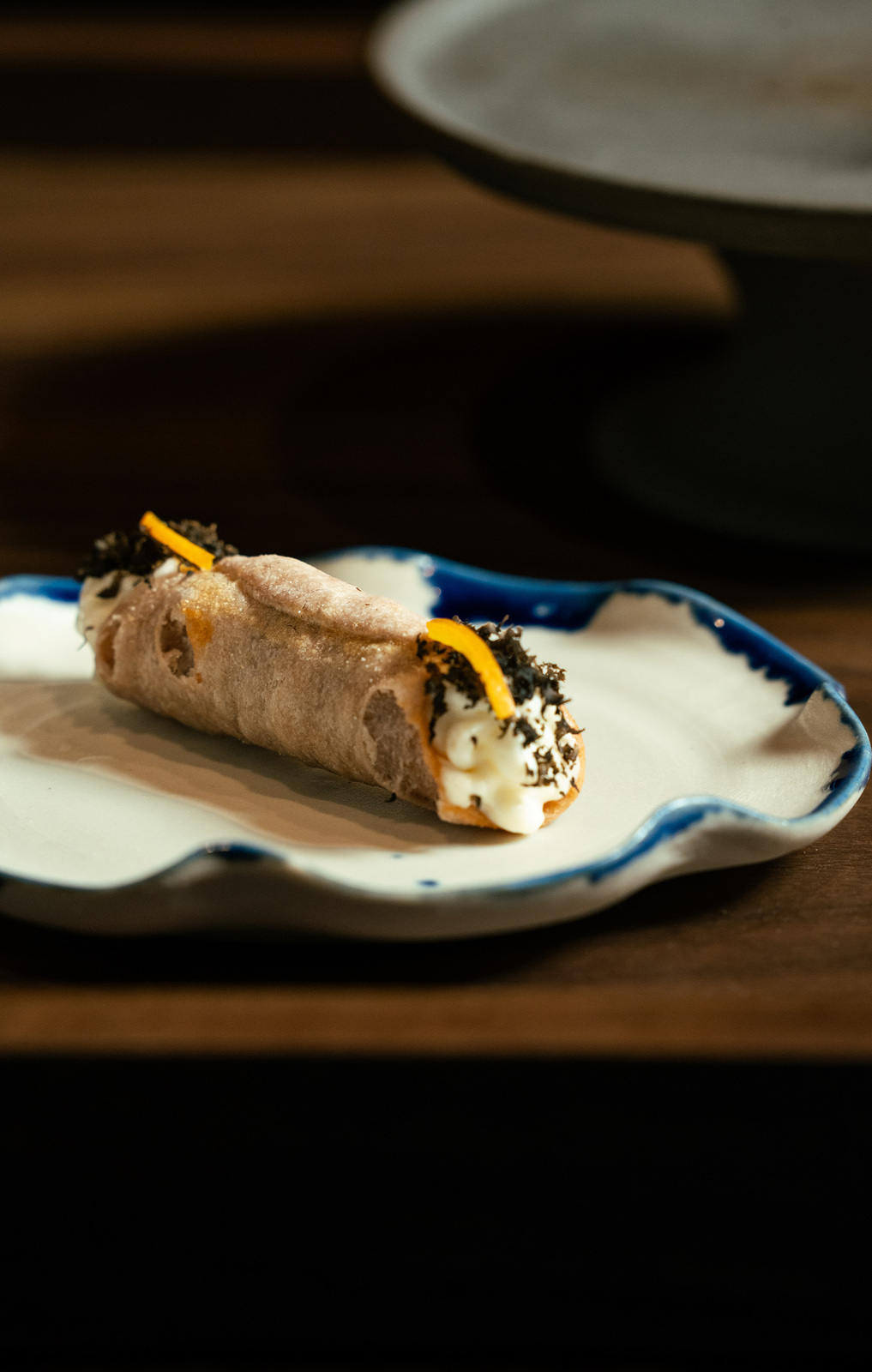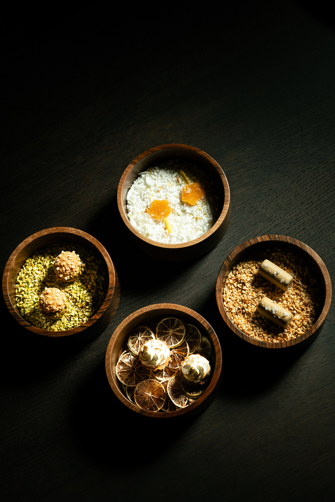 Il percorso Emozioni amplia la narrazione con cappelletti all’anatra con burro e timo, piccione con cipolla e funghi, una rinfrescante granita al basilico e una raffinata selezione di piccola pasticceria – rocher Zephyr, gelatina al mango, choux al pistacchio e lemon pie.