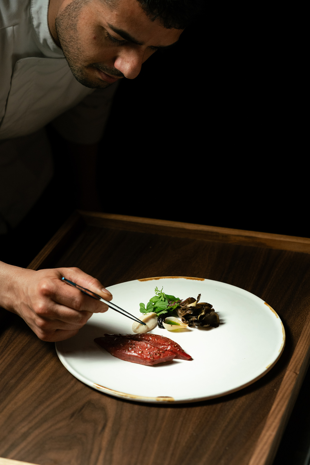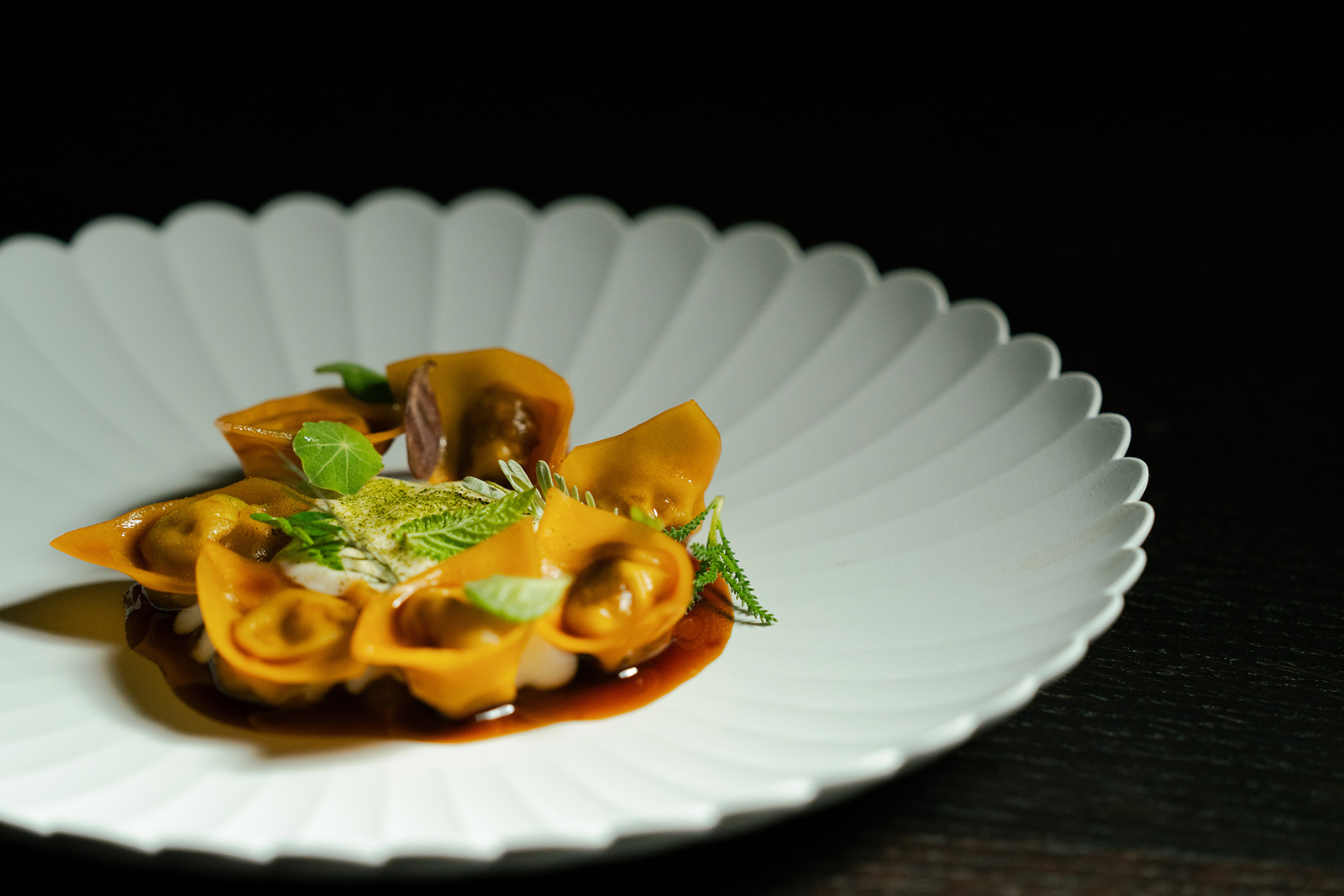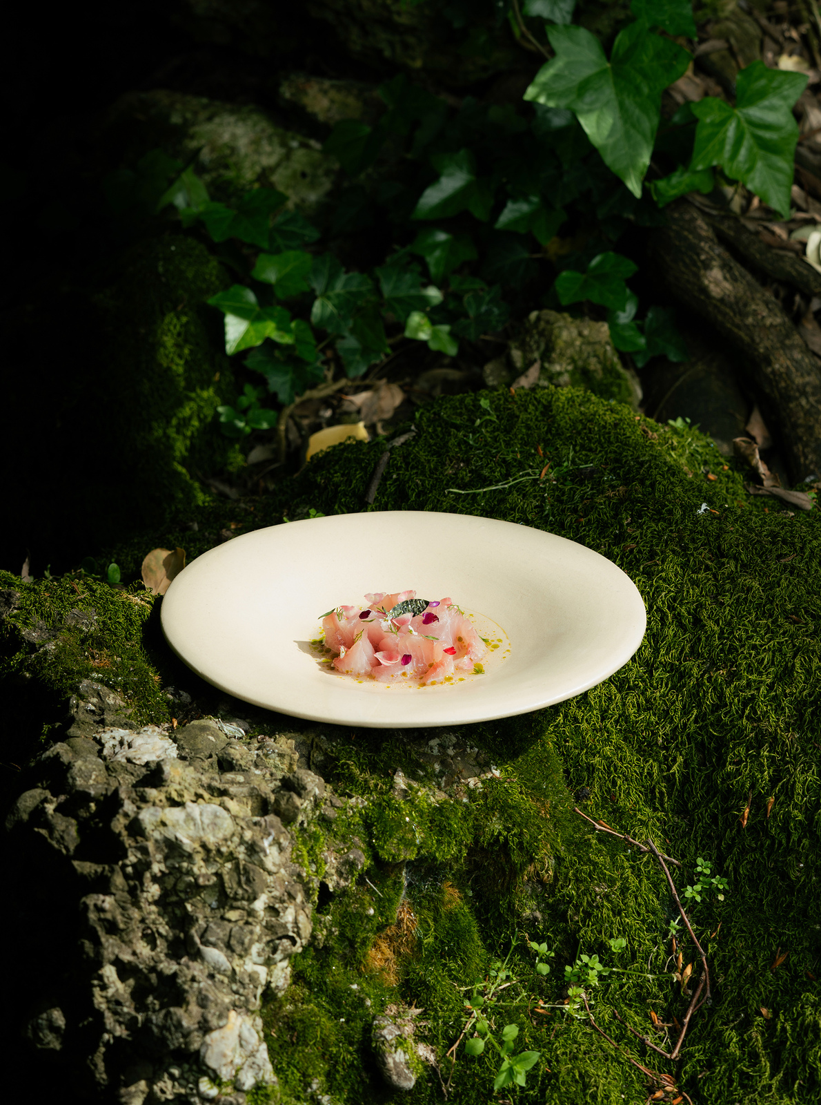 Il ristorante, recentemente inserito nella guida Michelin, è intimo ed esclusivo e accoglie soltanto diciotto ospiti. Gli ambienti, illuminati dalle ampie finestre che si aprono sul giardino, respirano un’atmosfera di sobria raffinatezza, in cui il design contemporaneo incontra la poesia del luogo. È qui che prende forma la visione di Paulo Airaudo, chef argentino di origini italiane, già insignito di sei stelle Michelin distribuite tra Amelia a San Sebastián (2 stelle), Aleia a Barcellona (1 stella), iBai a Donostia/San Sebastián (1 stella) e NOI a Hong Kong (2 stelle). Nel suo percorso figura anche La Bottega a Ginevra, moderna trattoria aperta nel 2015 e premiata nello stesso anno con una stella. La sua firma gastronomica, maturata attraverso esperienze nei più prestigiosi ristoranti del mondo, da Arzak a San Sebastián a The Fat Duck a Bray (Londra) a Magnolia in Italia, si esprime in una cucina che unisce rigore tecnico, sensibilità estetica, abbinamenti di sapori inediti e rispetto per la tradizione.