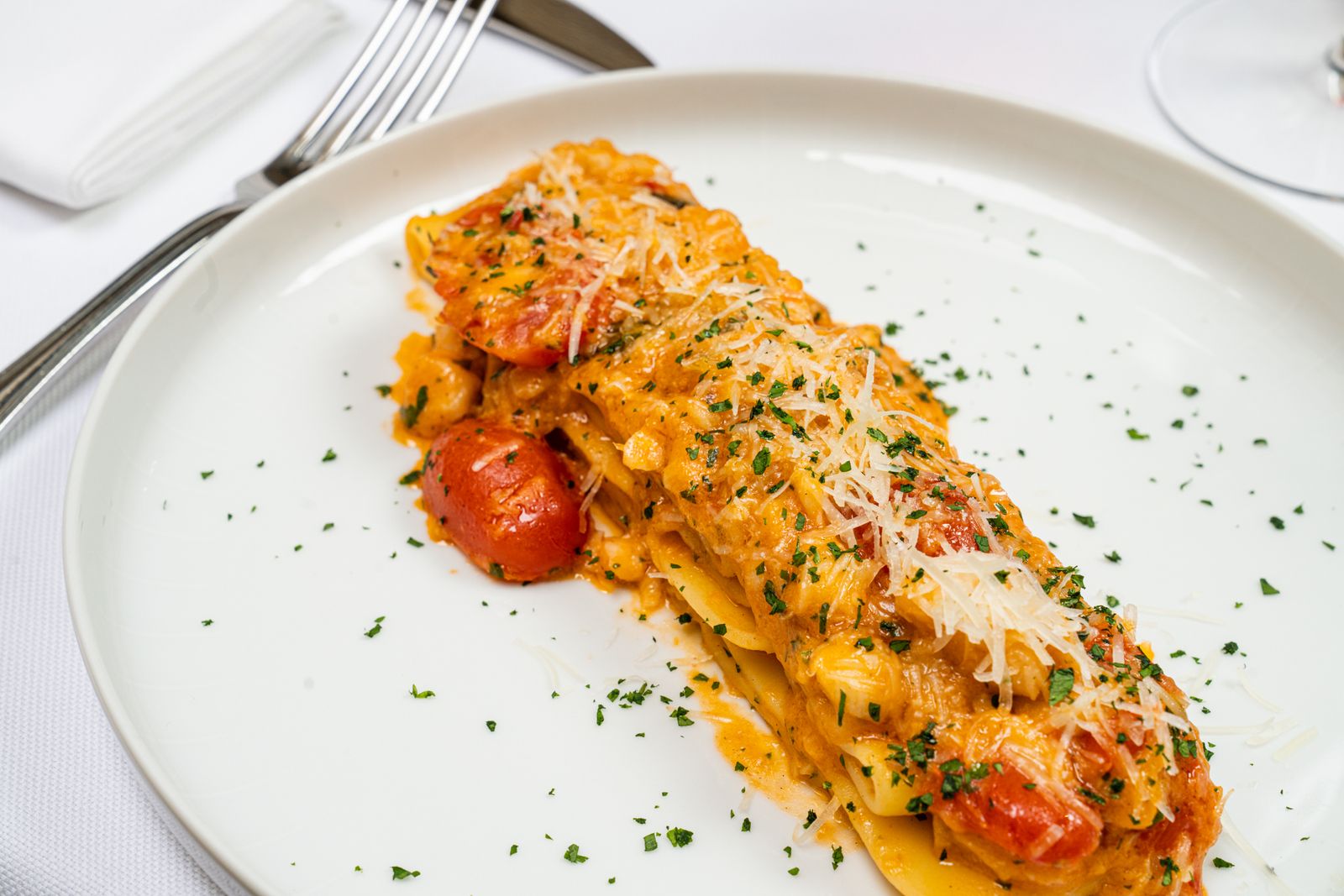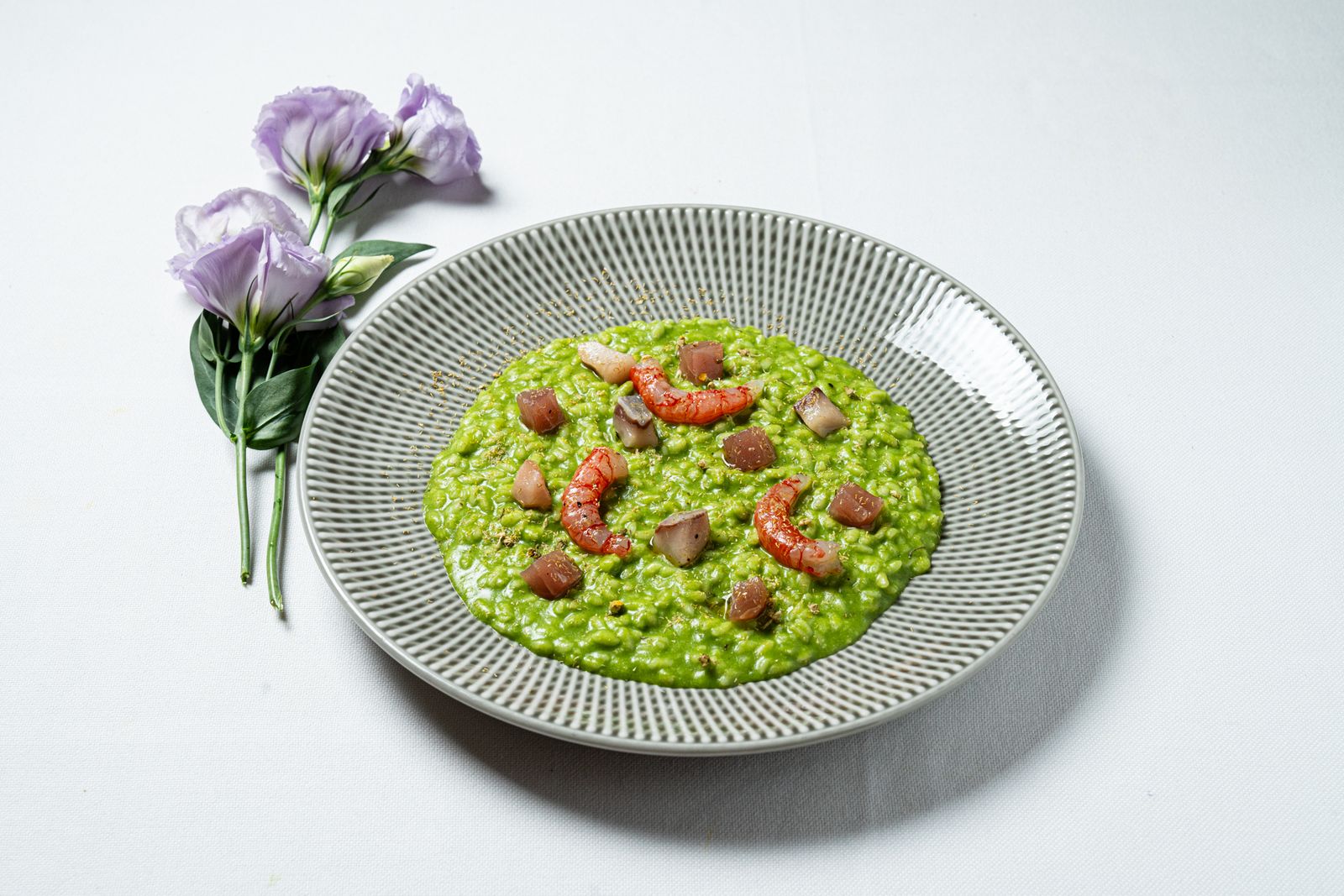 Nei primi piatti si incrociano cereali e formaggi, note aromatiche ed elementi marini. L’impostazione emerge da preparazioni quali Risotto vialone nano alla rapa rossa, fonduta di piave e noci pecan e Linguine monograno felicetti all’aglio nero, aneto, burrata e acciughe del Cantabrico, che delineano un lavoro su acidità, sapidità e grassezza.