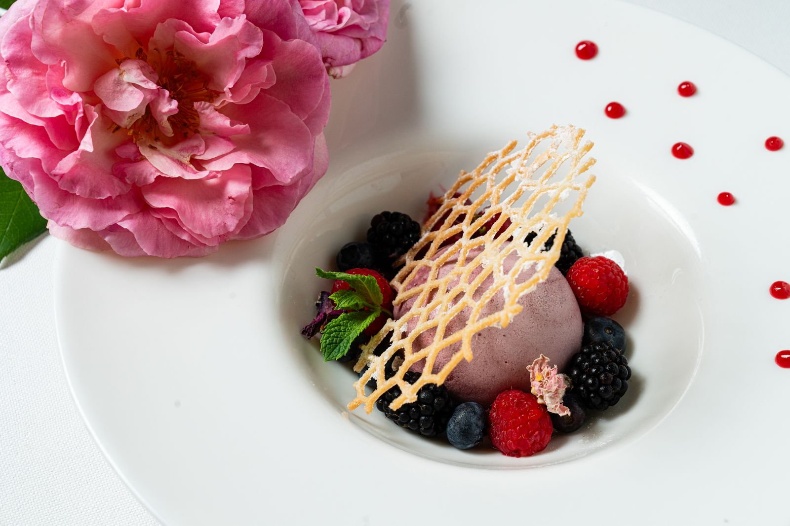 L’atmosfera è ritmata da dettagli che fanno la differenza: un allestimento floreale preparato ad hoc e un accompagnamento musicale di sottofondo discreto, progettati per esaltare l’evento senza invaderlo. La qualità del servizio è affidata a un cameriere dedicato.