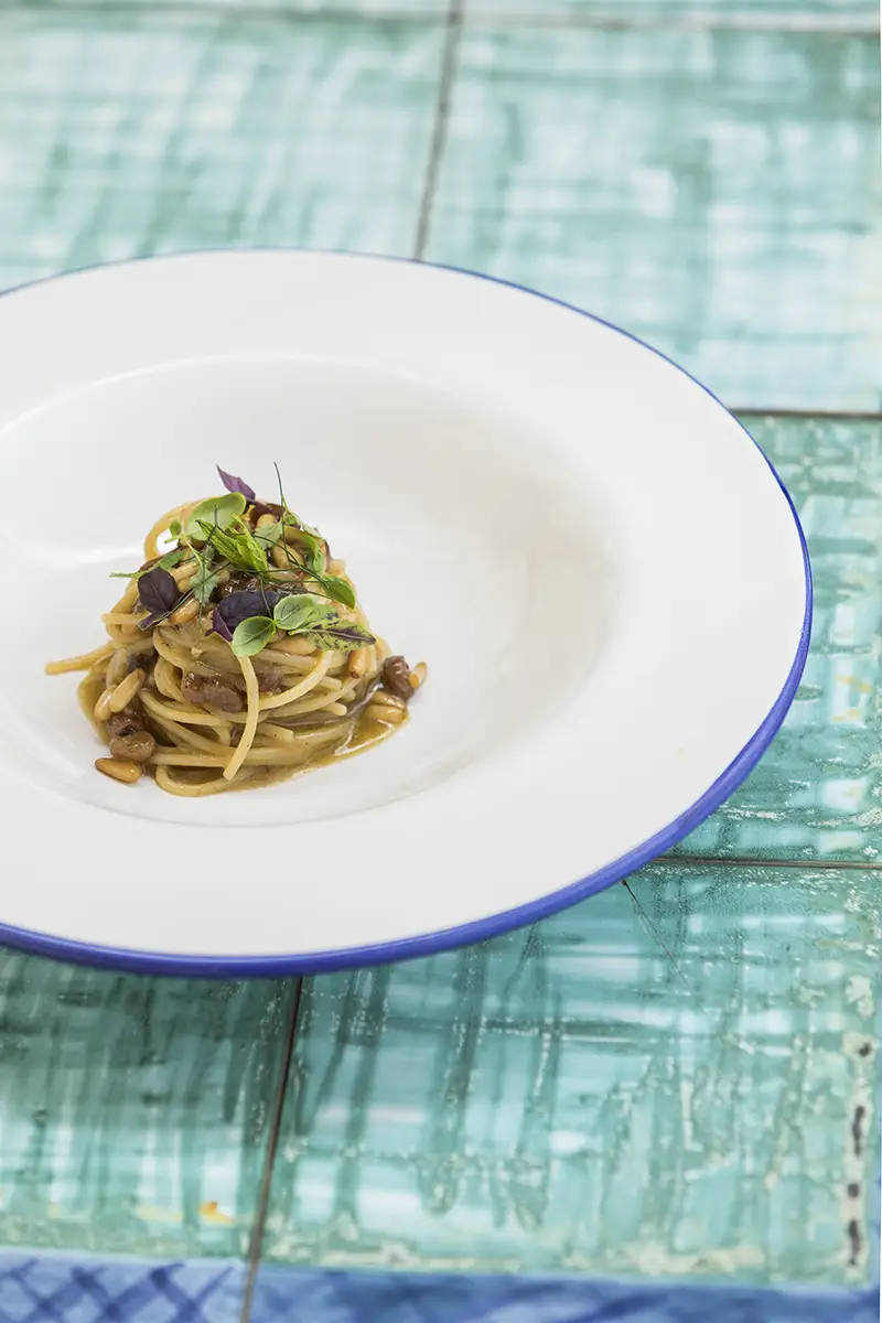 Il piatto simbolo della casa sono gli Spaghetti del Monastero, ideati da Gabriele Mattera per accogliere gli amici artisti: una combinazione tanto semplice quanto complessa di pinoli, uvetta e menta, perfezionata nel tempo e divenuta la firma del ristorante.