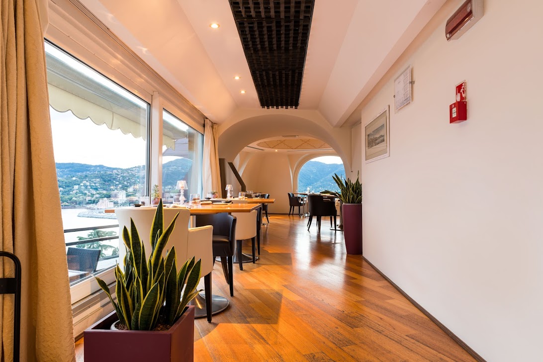 Alcuni tavoli del ristorante Le Cupole offrono una vista privilegiata sul Golfo del Tigullio, incorniciati da ampie vetrate o, durante i mesi estivi, posizionati all’esterno, sulla terrazza panoramica. Godono di una vista aperta sulla costa e sul promontorio di Portofino, che cambia colore con le ore del giorno.