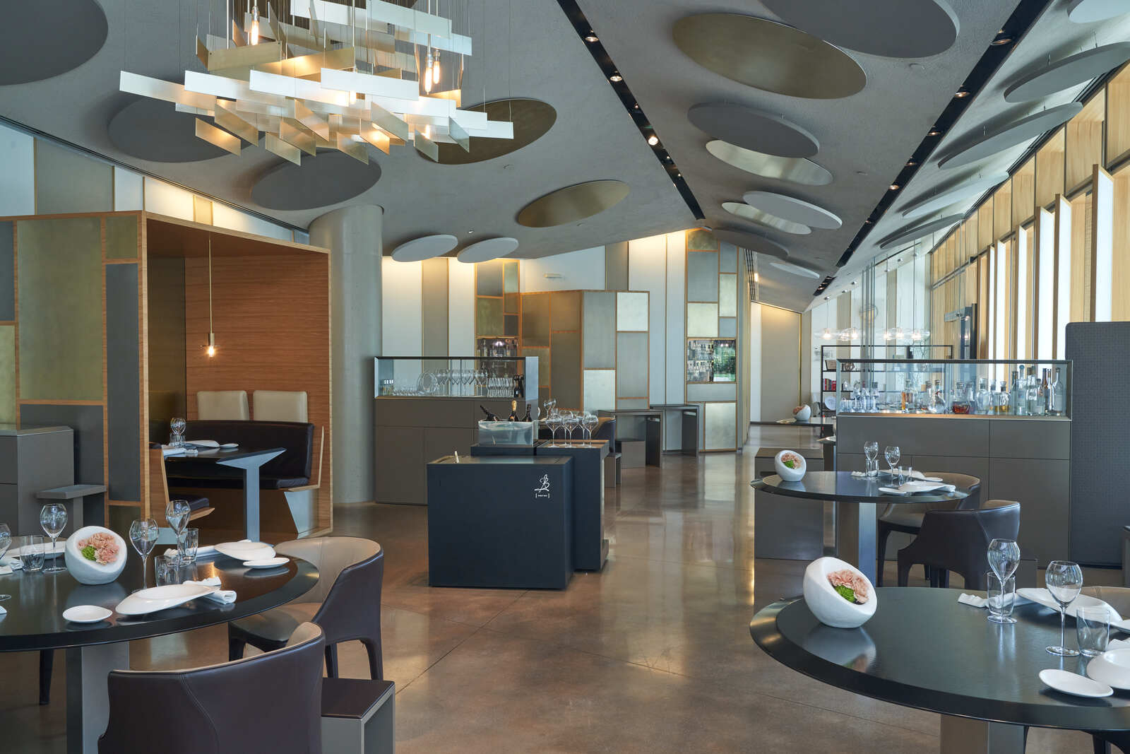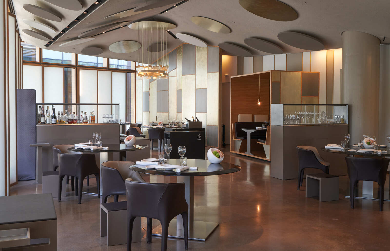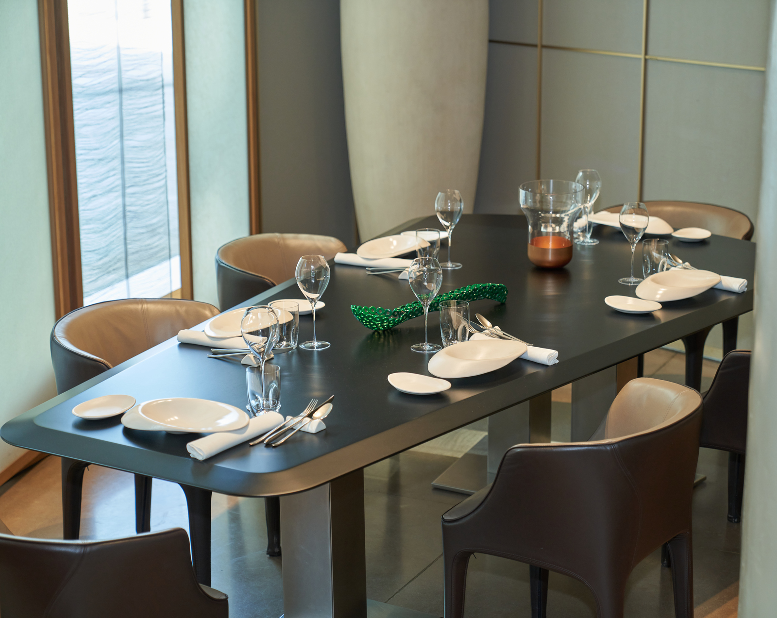 La sala del ristorante riflette l’austerità raffinata dello chef: uno spazio elegante e rigoroso, illuminato da ampie vetrate, dove la cucina a vista regala agli ospiti la possibilità di osservare i movimenti della brigata. Il tavolo in cucina descritto nella sezione L'esperienza prosegue al di là del vetro che separa la sala dalla cucina con un tavolo per quattro persone avvolto da una nicchia in legno che concede maggiore privacy. C'è inoltre una saletta privata per incontri fino a dieci ospiti.