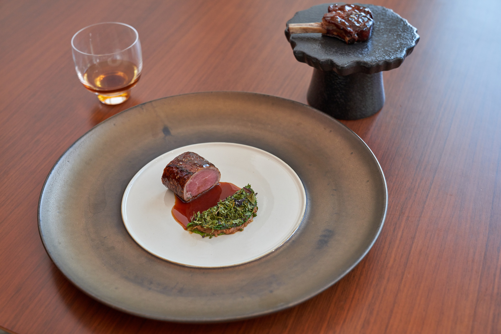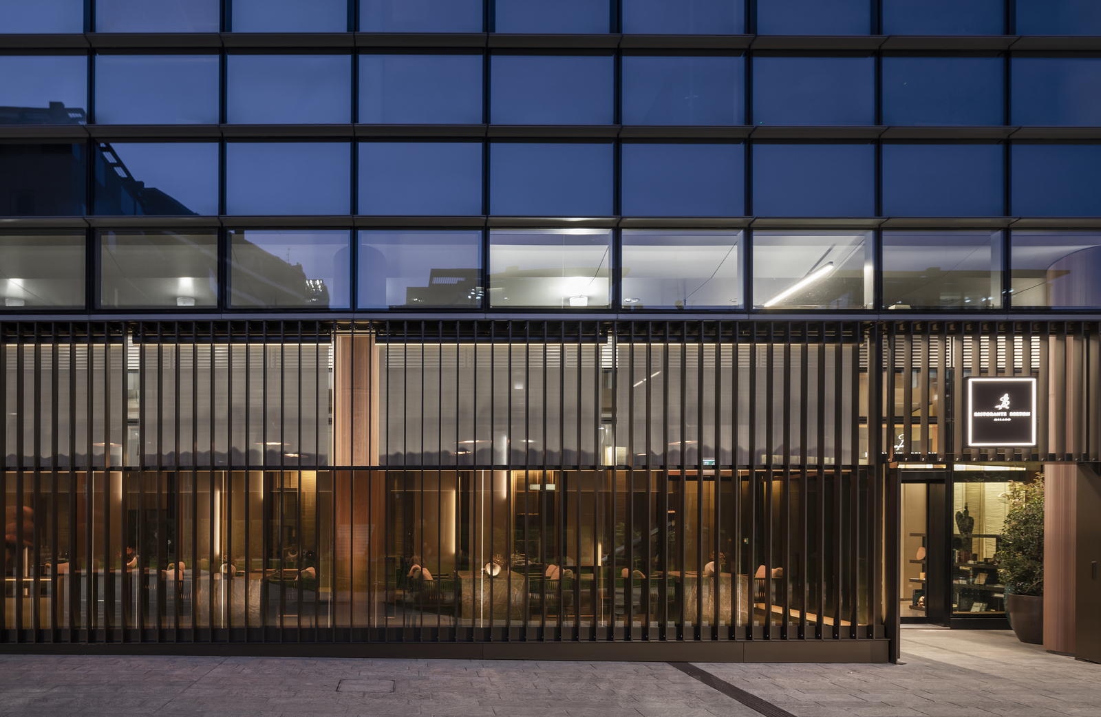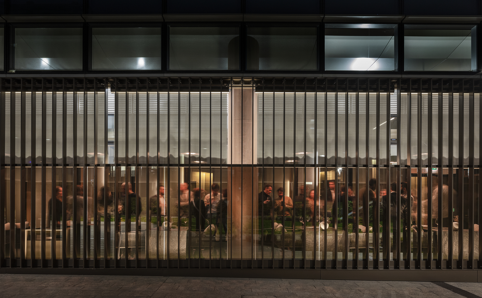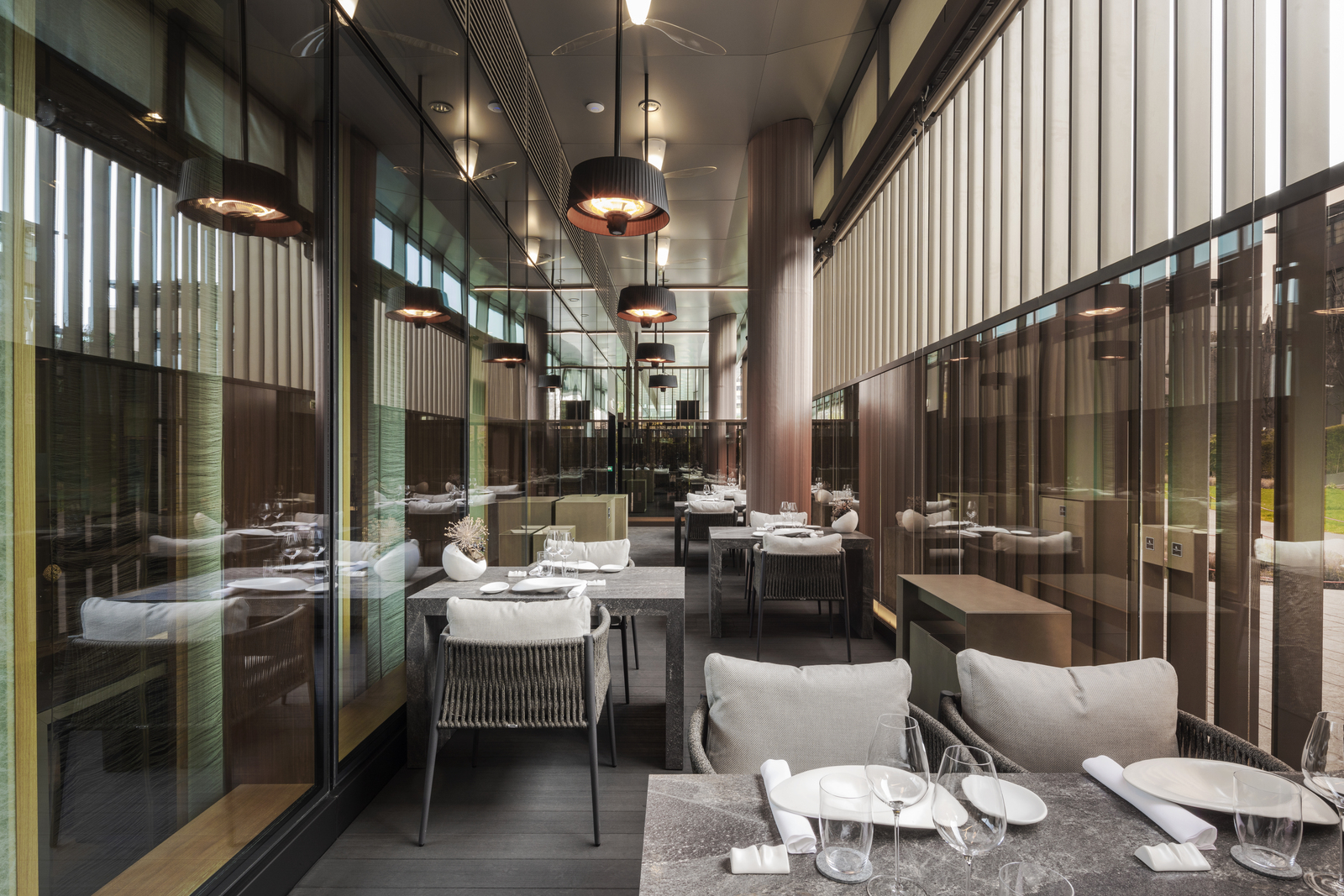 Il ristorante si apre verso l’esterno con un dehors di 14 coperti, nato dalla collaborazione tra lo chef e l’architetto Franco Driusso. Qui design e tecnologia si fondono per garantire comfort in tutte le stagioni: vetri riflettenti contro l’irraggiamento solare, tende retrattili, sistemi di ventilazione e un grande brise soleil in alluminio brunito proteggono l’ambiente creando un microclima ottimale. I materiali scelti, dal legno composito eco-sostenibile per la pavimentazione ai tessuti dalle tonalità calde ed eleganti, traducono in materia il binomio tra funzione e forma, con un’attenzione particolare alla sostenibilità e all’armonia con il contesto urbano circostante.