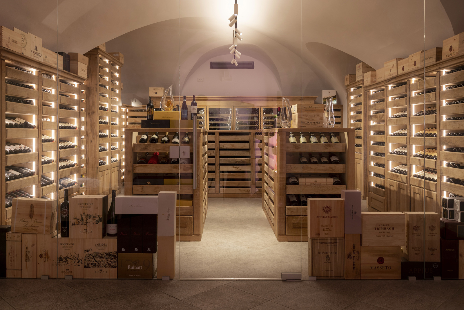 Ai piatti si affiancano e le proposte della cantina che, disegnata dallo stesso Griffa e realizzata interamente da artigiani valdostani in legno di rovere antico naturale, ospita oltre 1000 etichette e 3000 bottiglie che includono, oltre ai grandi classici italiani e francesi, una selezione di vini valdostani che propone anche produttori di nicchia.